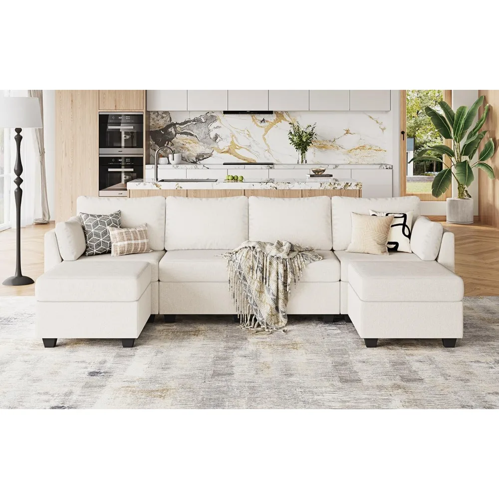 This item is a versatile modular couch that can be arranged in various configurations such as L-shaped, U-shaped, or even as a sofa bed. It is designed to meet different needs and can be expanded with additional modules. The sofa is covered in breathable, high-quality fabric and features high-density foam cushions that resist deformation, providing comfort and relaxation for various body types. It is built with a solid wood frame and U-shaped connectors, ensuring strong support with each seat capable of holding up to 300 lbs. The craftsmanship is expert, ensuring durability and a stable, noise-free experience. Each seat of this living room sectional sofa includes hidden storage compartments, ideal for storing items like blankets, pillows, and toys. The dimensions of each seat are 25.59 inches long, 25.59 inches wide, and 6.8 inches deep, helping to keep your living area organized and clutter-free.