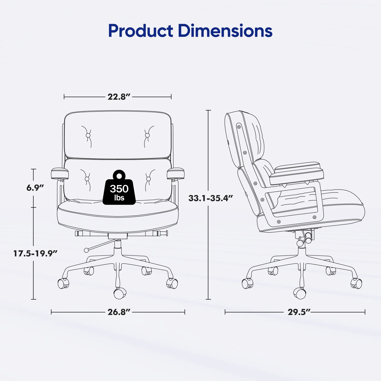 1.Large Home and Office Chair Measures: 26.8x29.9x34.6-38.6 inches (LxWxH); Seat Depth 19.9 inches, Seat Width 23.2 inches, Seat Back Height 18.9 inches.