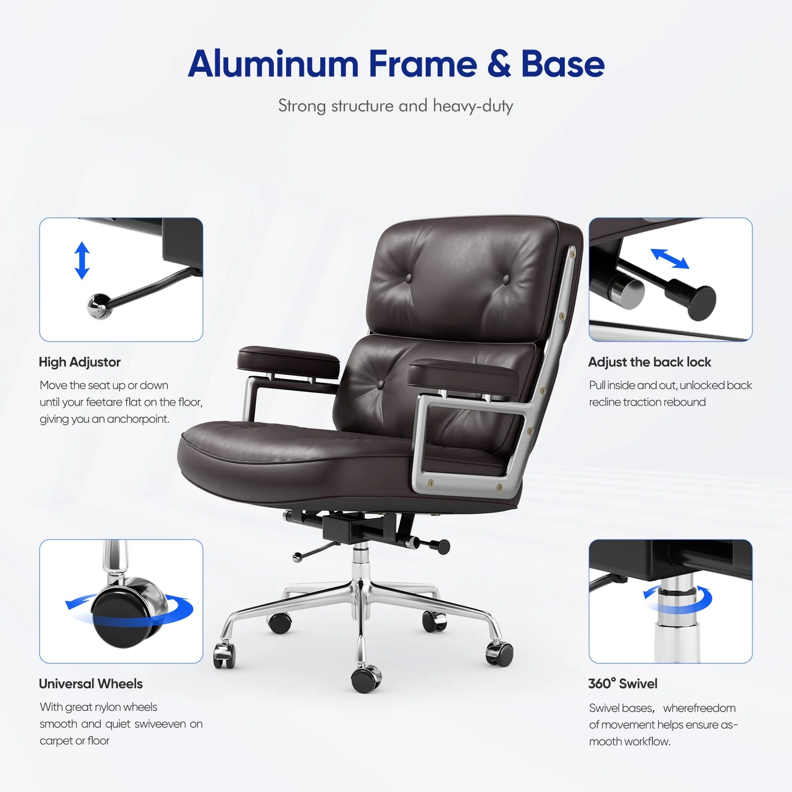 4.Heavy Duty Aluminium Alloy Frame and Base, with 5 Legs and Durable Silent Nylon Casters for Smooth-Rolling Mobility; Office Chairs Net Weight-44lbs, 300-Pound Capacity for Heavy People.