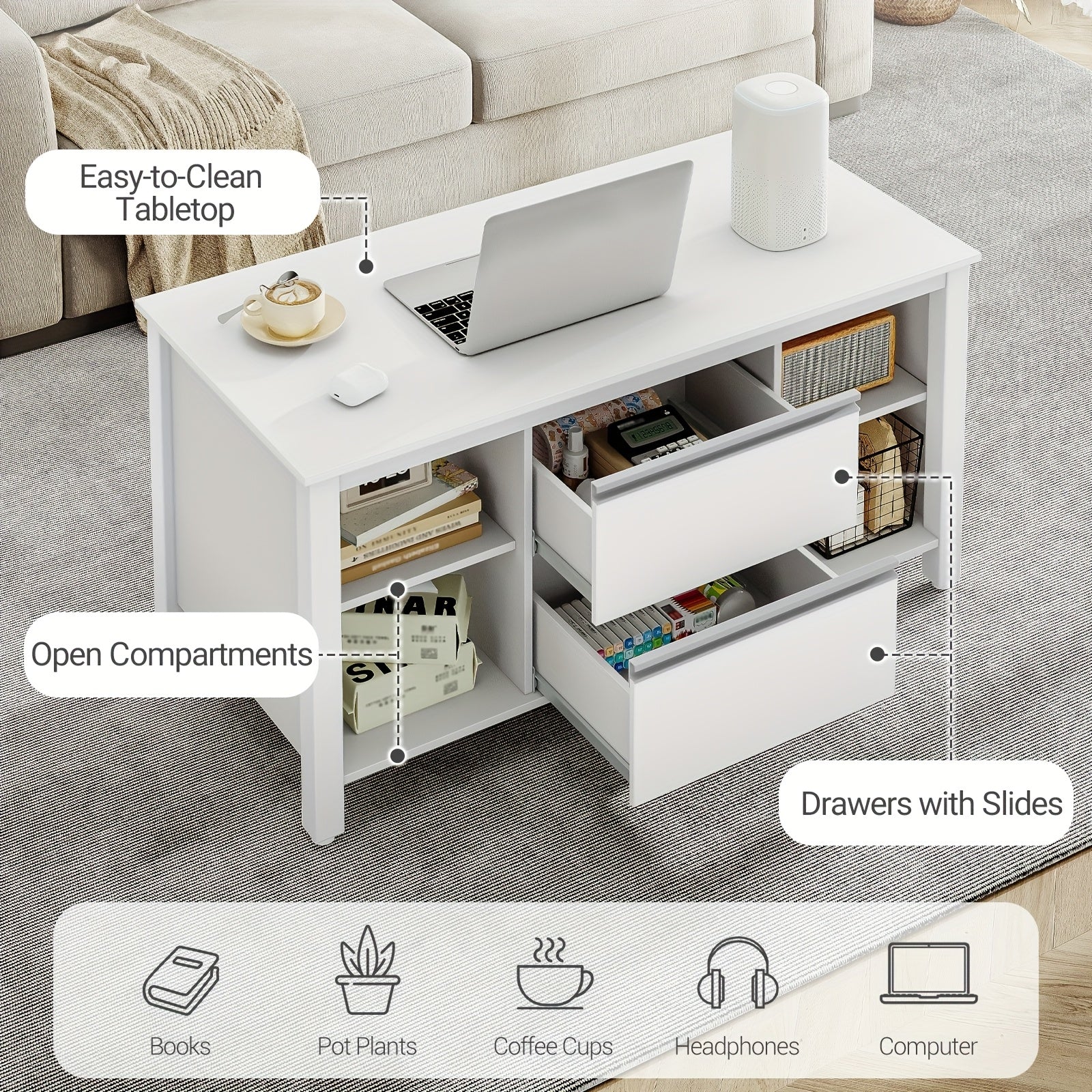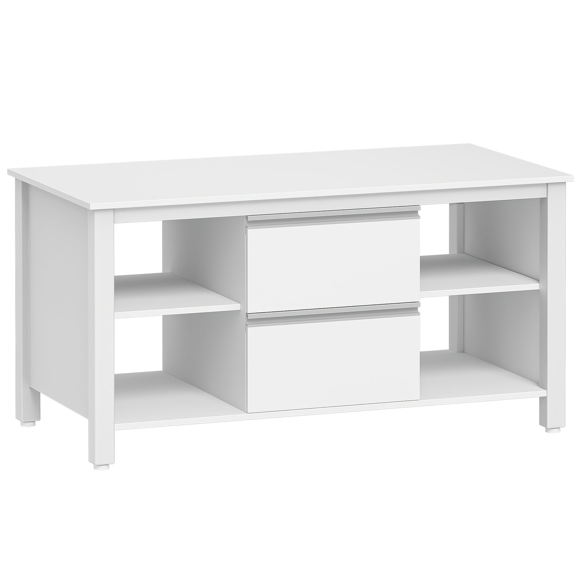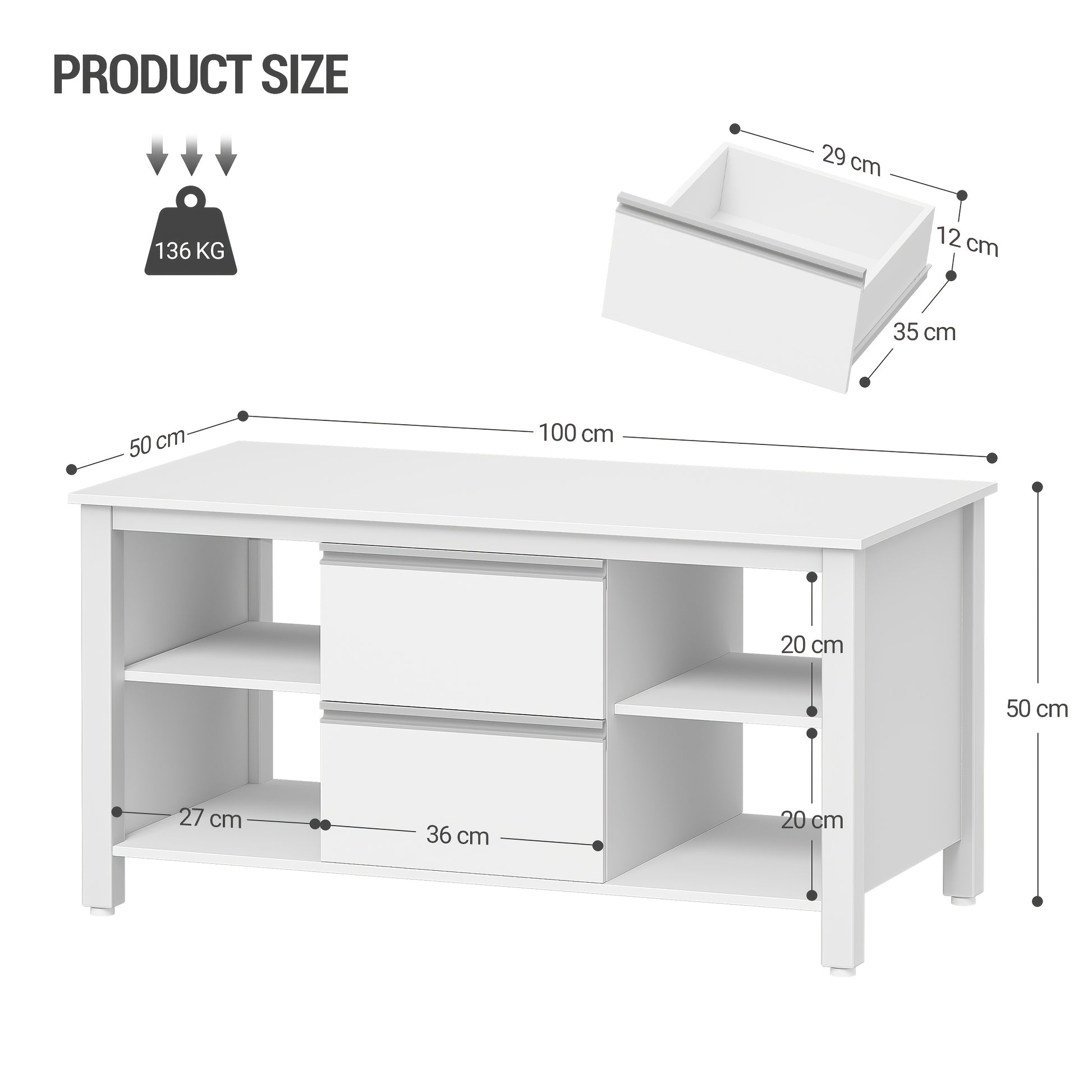 This coffee table for the living room offers ample storage with a functional tabletop measuring 100 x 50 cm, along with two drawers and four open sections. It provides designated spots for books, remote controls, and cups, enhancing storage while keeping a spacious appearance.